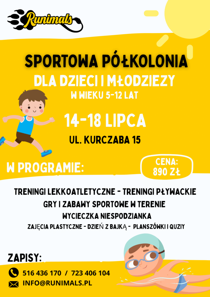 Będziecie mogli poczuć się szybcy jak gepard podczas treningów lekkoatletycznych i jak ryba w wodzie w trakcie zajęć na basenie. Pokażemy Wam kilka zabaw i gier wymagających współpracy i rozwijających orientację w terenie. Zadbamy aby brzuszki były pełne i dawały energię do zabawy a jak już zmęczenie będzie doskwierało –  odpalimy super seans filmowy, zagramy w planszówki  albo zamienimy się w artystów.  Na sam koniec mamy dla was wycieczkę niespodziankę  ale jej szczegóły możemy zdradzić tylko zainteresowany rodzicom w ofercie, którą znajdziecie poniżej!